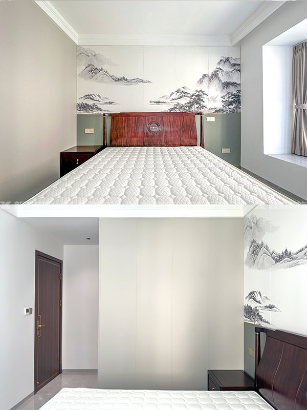 入戶(hù)柜與客廳用紅色屏風(fēng)隔斷,連接水墨畫(huà)背景,余韻十足