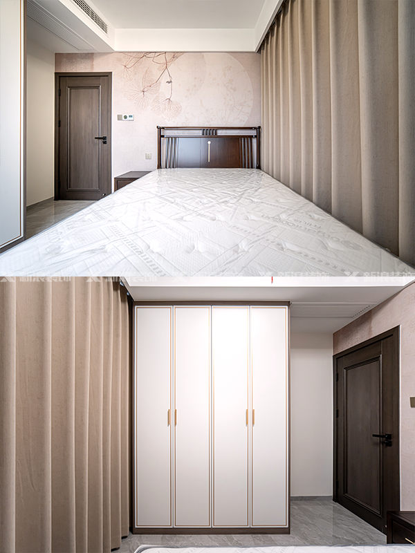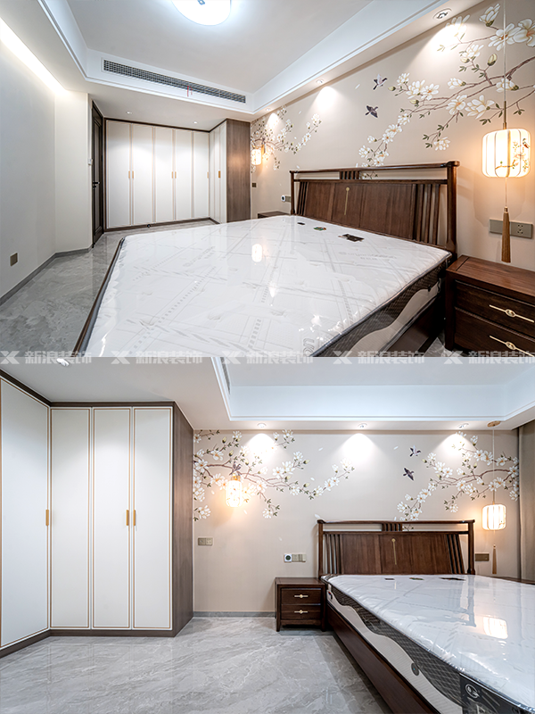 臥室也都做了中國畫(huà)床頭背景,實(shí)木床以及一門(mén)到頂線(xiàn)條造型定制柜搭配相得益彰。