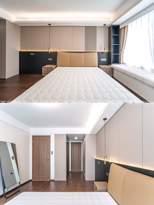 電視墻和主臥背景墻拒絕冷硬的石材,用淺色木飾面搭配黑色定制柜和暖色燈帶,在現代黑白風(fēng)格里也留有溫馨。
