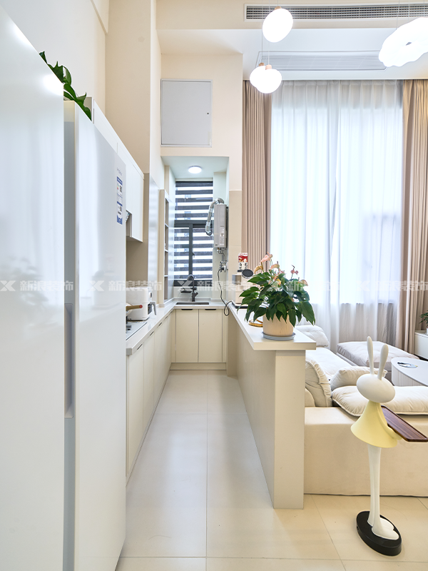 開(kāi)放式一字長(cháng)條廚房,中間做半墻隔斷,操作臺+水吧臺一體