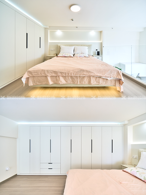 臥室用主燈+氛圍線(xiàn)型燈搭配,營(yíng)造溫馨浪漫的氛圍
