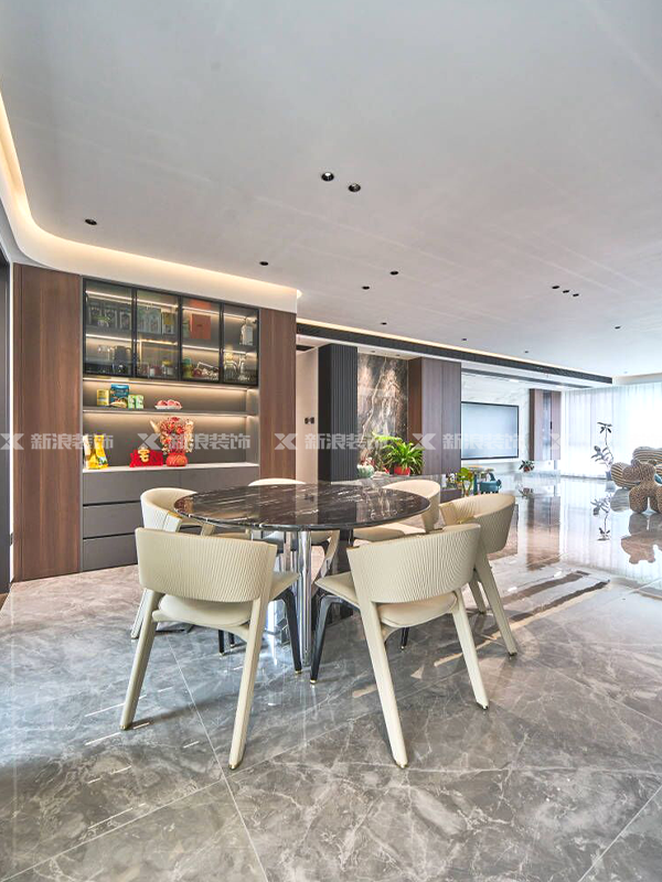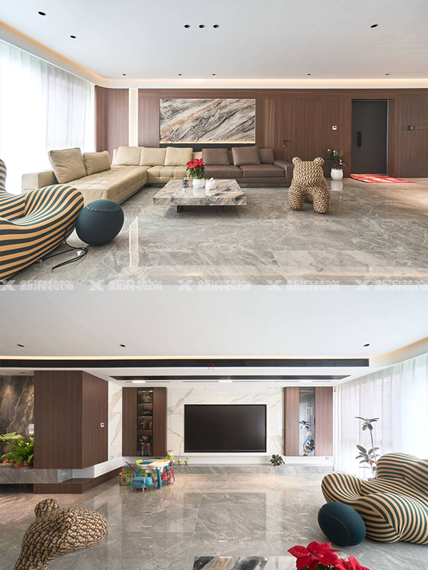 沙發(fā)背景和電視背景均采用巖板設計,進(jìn)行點(diǎn)綴以及呼應整個(gè)空間