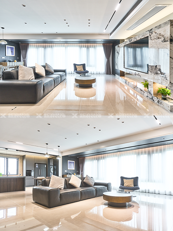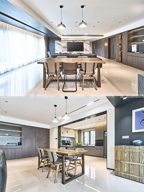 客餐廳做全開(kāi)放式的布局,實(shí)現了視線(xiàn)的延伸,放大了大戶(hù)型的縱深感。